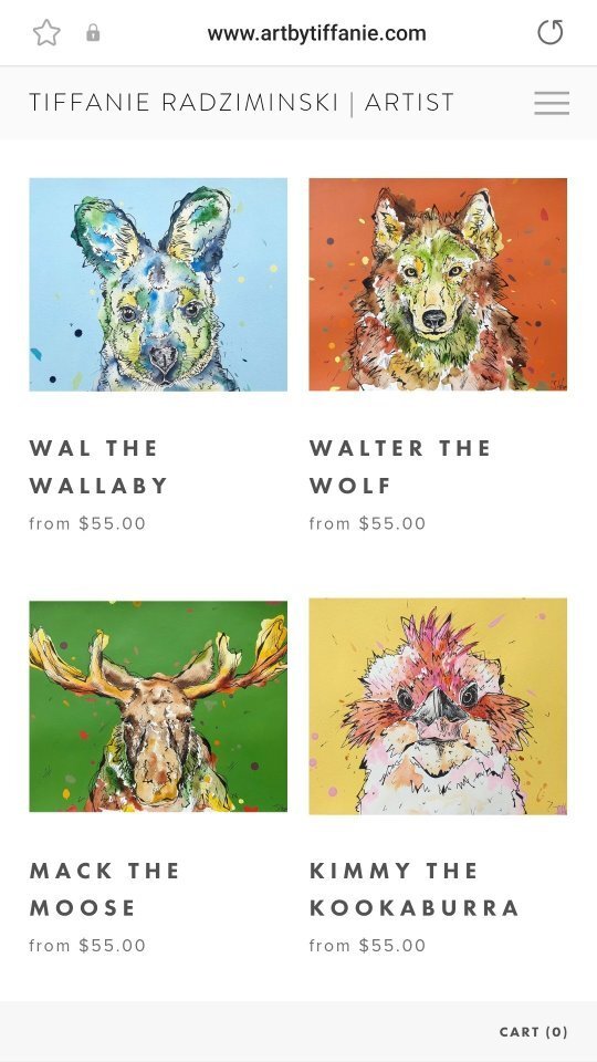 Tiffanieโs practice combines the art forms of painting and drawing using a variety of techniques. She focuses on the development of contemporary, fun and playful art depicting a wide range of animals, most commonly dogs and Australian wildlife.